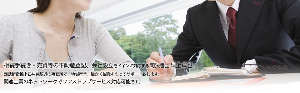 当事務所は、練馬区上石神井に所在し、「相続登記」や住宅ローンを完済された際にする「抵当権抹消登記」、売買や贈与、財産分与に伴う「所有権移転登記」などの不動産に関する登記、その他会社設立や役員変更などの商業登記、遺言書作成支援業務を主な業務としております。小規模な事務所ではございますが、お客様との最初のやり取りから具体的な手続きまで、すべて認定司法書士が担当させていただいております。電話や